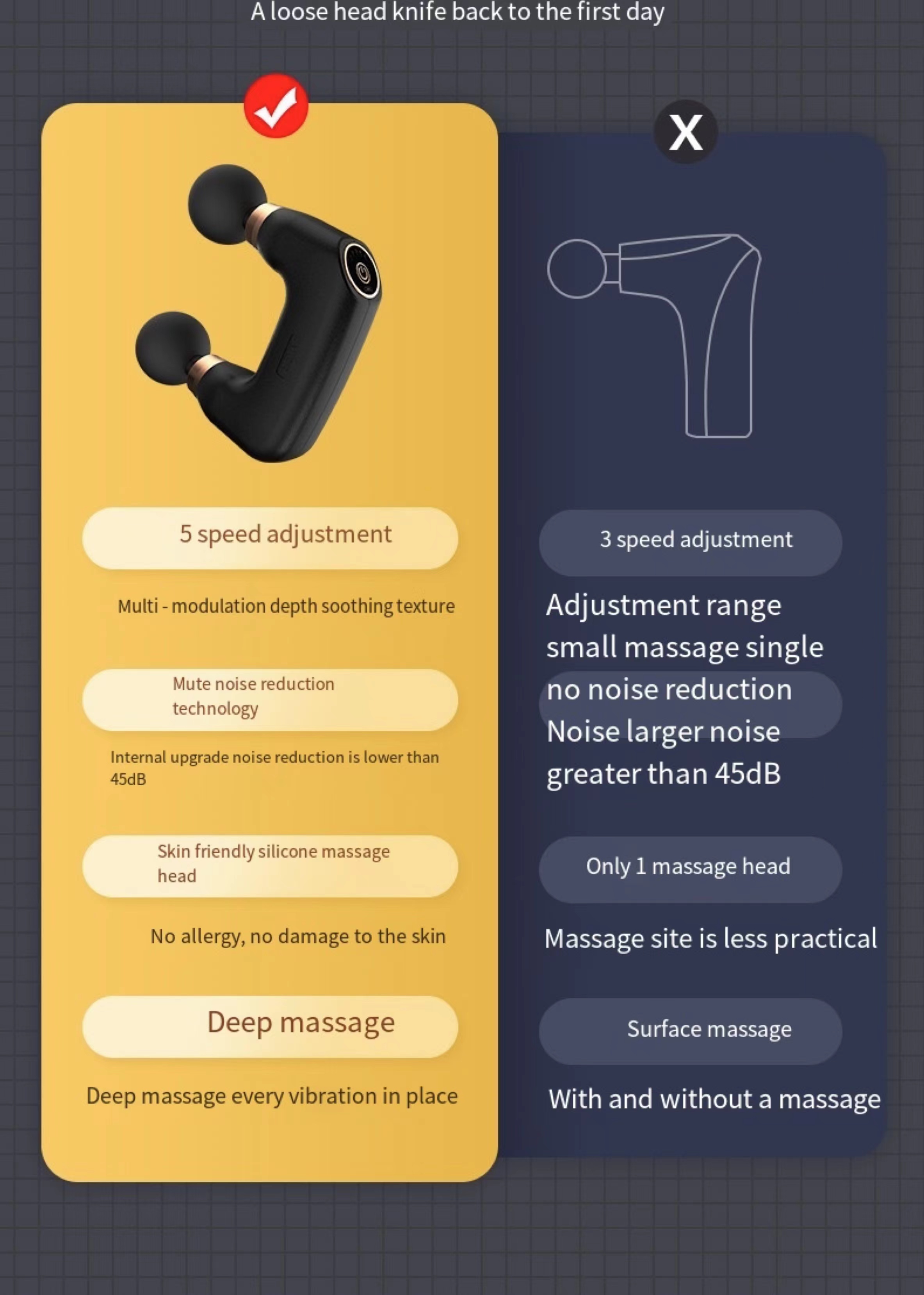 দুইটি একসাথে চলমান ম্যাসাজ হেড পেশির গভীরে কাজ করে অধিক কার্যকর ম্যাসাজ প্রদান করে।