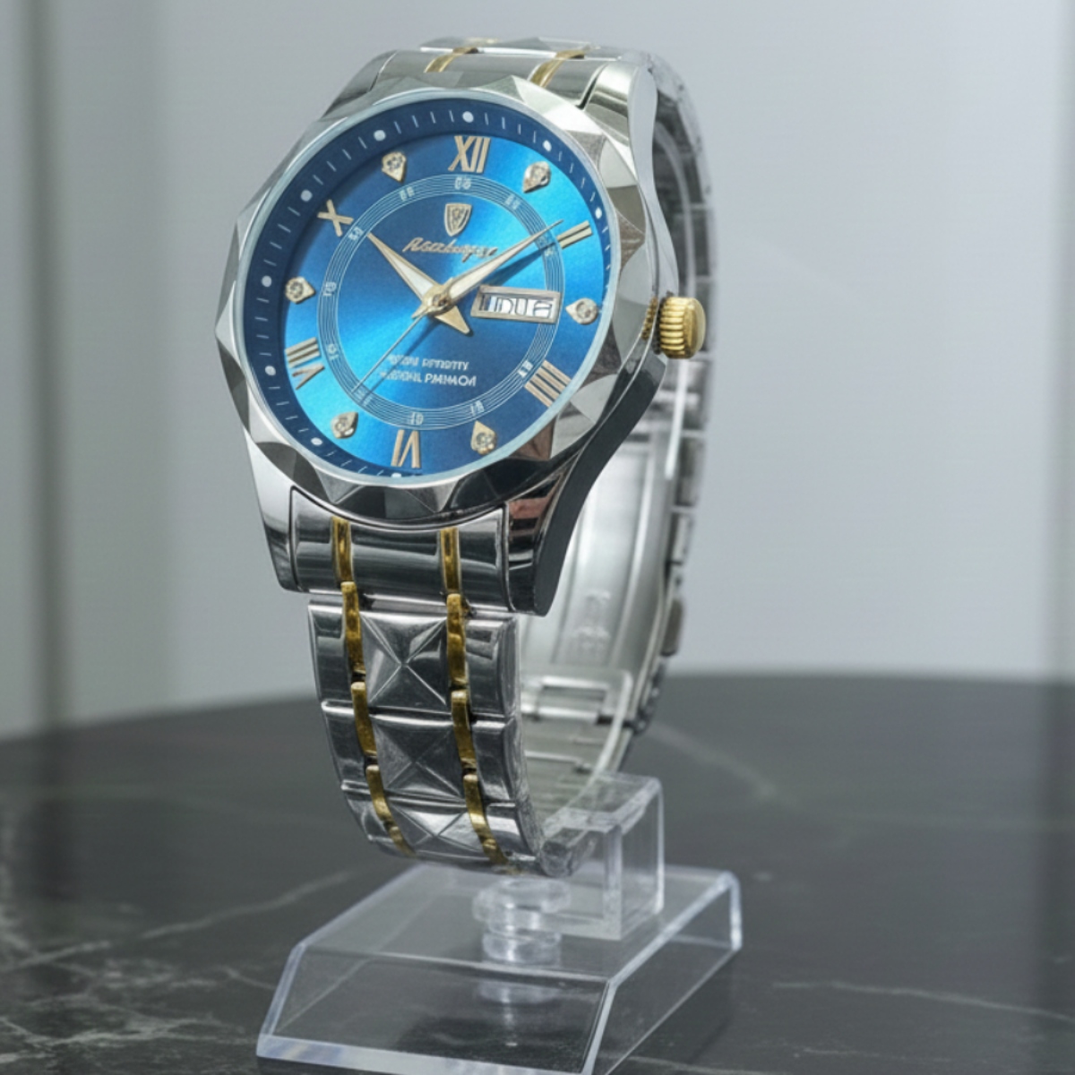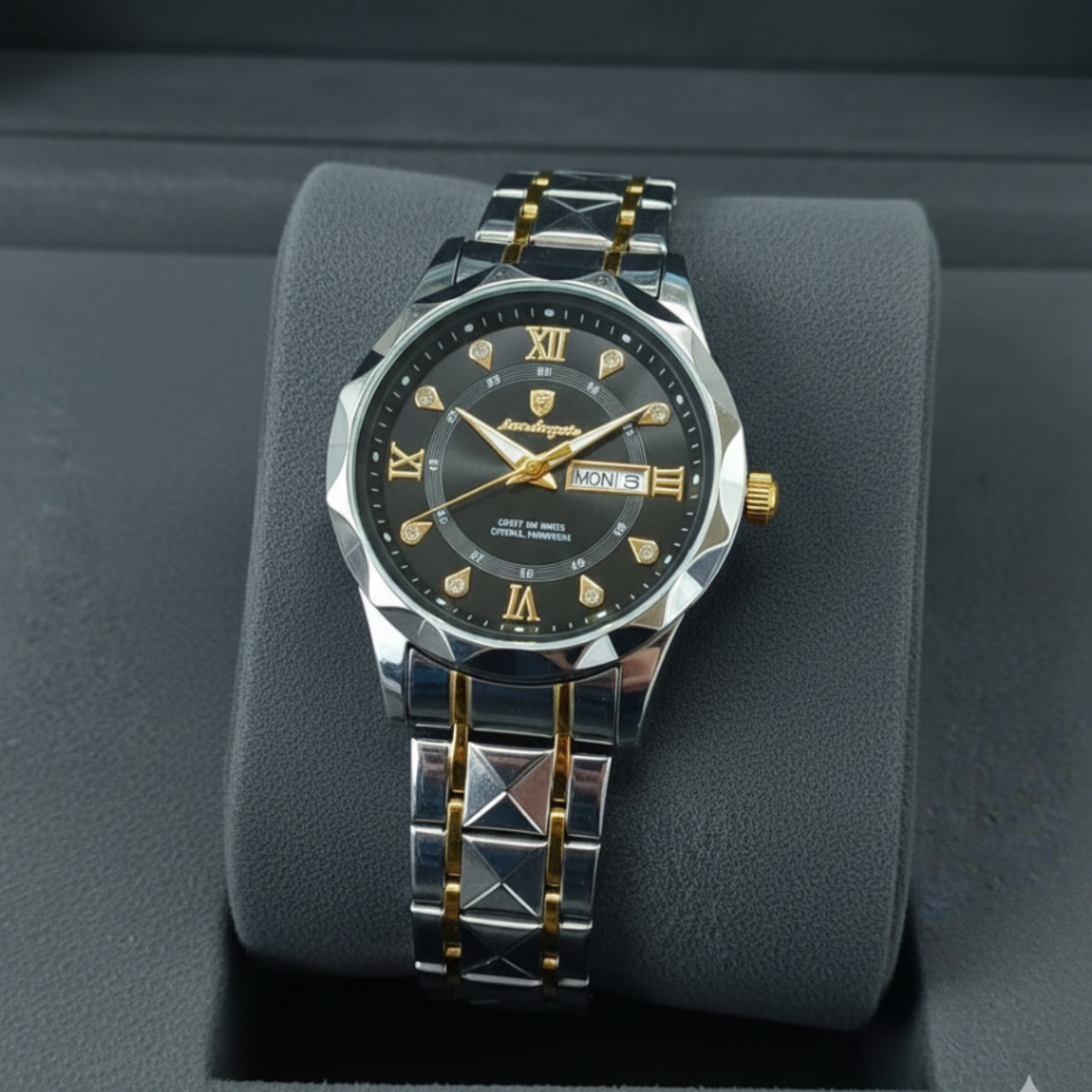 ডায়ালে রোমান সংখ্যা এবং পাথরের কাজ দেওয়া আছে, যা ঘড়িটিকে লাক্সারি লুক দেয়।